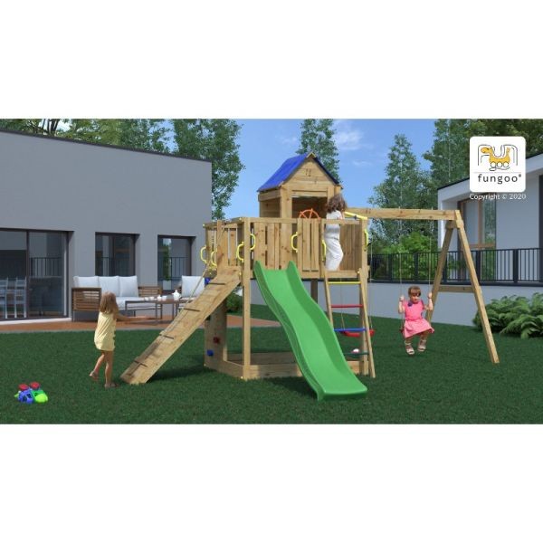 Fungoo Treehouse este gata echipat de joaca! Transforma gradina intr-un loc plin de aventuri pentru cei mici! Proiectat pentru distractie maxima, acest complex de joaca include o casuta tip treehouse, platforme inaltate, tobogan de 2.2 m. Acest loc de joaca estea realizat conform tuturor standardelor CE si este complet sigur.